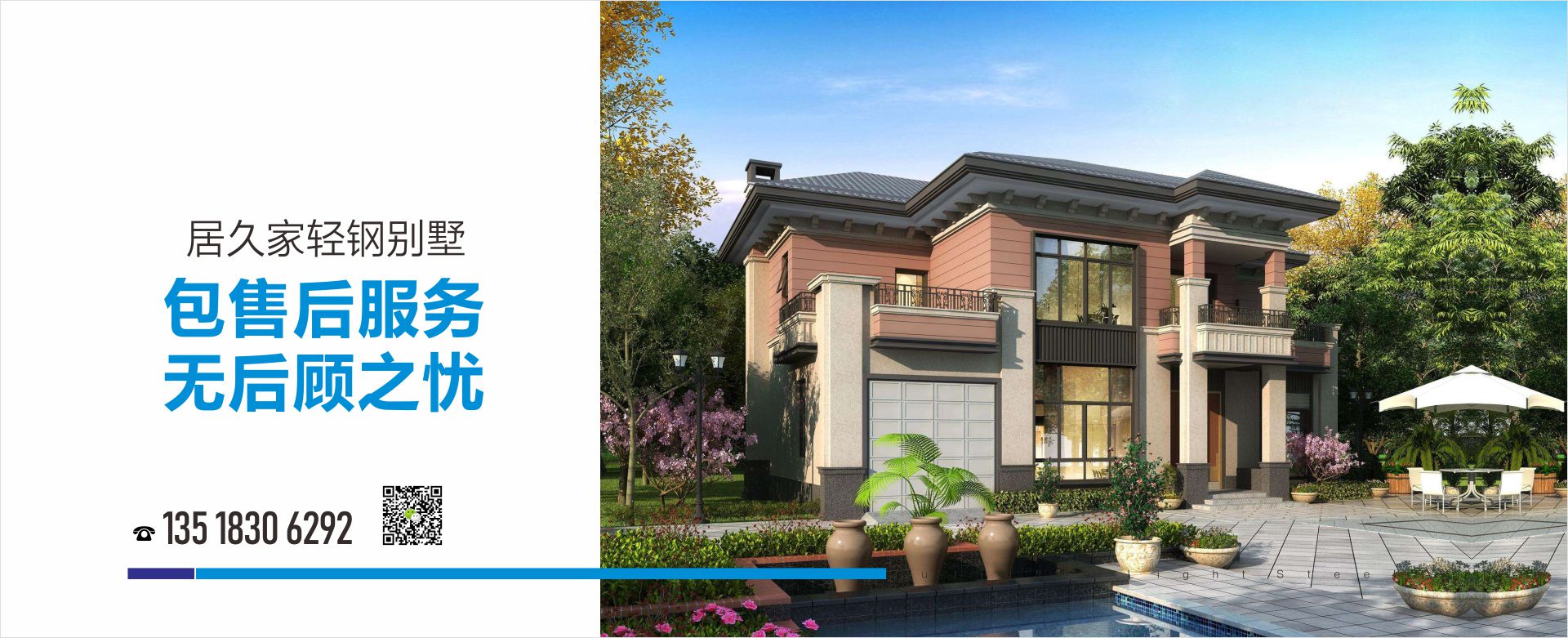 居久家輕鋼別墅自從業以來,一直秉承科學施工,嚴謹施工,安全施工的原則立足業內,公司始終以推廣和普及綠色、節能輕鋼結構建筑為己任,不斷積累經驗,開拓創新。迄今為止,已完成上百套輕鋼別墅的修建,收到客戶的廣泛好評。