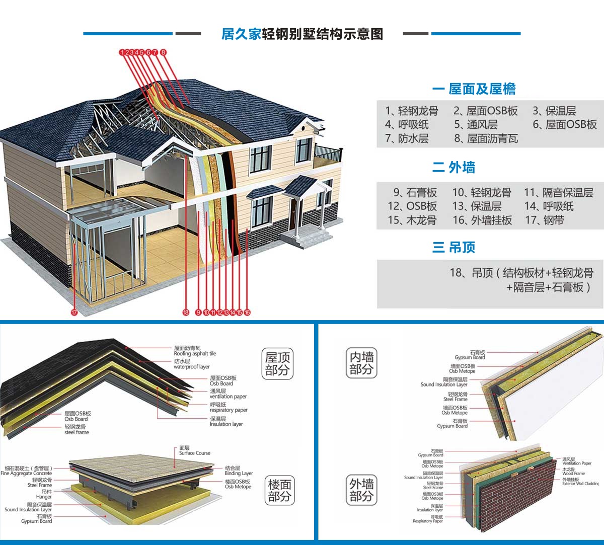 四川輕鋼別墅墻體采用阻燃材料玻璃纖維棉填充,屋頂有天溝設計,屋面鋪有一層單向防潮呼吸紙。